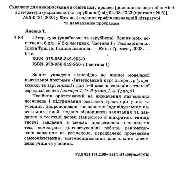 Література українська та зарубіжна, 6 кл., Зошит моїх досягнень Ч.1 – Яценко Т. – Грамота (107458)