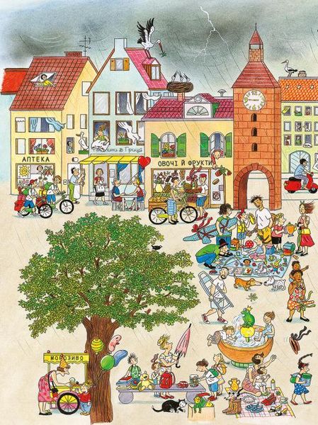 У містечку Мала Метушня достигають черешні, діти бігають босоніж, а грозові хмари, пролившись рясним дощем, швидко поступаються місцем яскравому сонцю. Ротраут Сузанне Бернер розповідає безліч маленьких історій: про день народження Сьюзі в парку, цікавинки з барахолки, загубленого пінгвіна та мишку, яка ховається на кожній сторінці.
