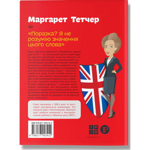 Маргарет Тетчер народилася у простій родині в непрості часи. Дівчинка мріяла змінити свою країну на краще, та політика була світом чоловіків. Подорослішавши, Маргарет зламала цей стереотип і стала прем’єр-міністеркою. Перед вами дивовижна історія видатної леді, написана спеціально для дітей. Мотивувальна біографія «Маргарет Тетчер» розповідає дітям про непересічне життя та досягнення видатного політика, прем’єр-міністерки Великої Британії. Маргарет стала першою жінкою на посаді прем’єр-міністра не лише у своїй країні, а й у всій Європі. Вона була єдиним британським прем’єр-міністром ХХ століття, який вигравав вибори тричі поспіль. Вона найдовше обіймала цю посаду серед усіх прем’єр-міністрів країни з 1827 року. Тетчер народилася у звичайній родині й здобула освіту хіміка. Але жінка вірила, що її місце в політиці. Вона знала, що може змінити свою країну на краще та допомогти багатьом людям. Але стати навіть депутаткою жінці в ті часи було непросто. Тетчер доводилося боротися із численними упередженнями й стереотипами. На посаді прем’єр-міністерки вона впроваджувала корисні для економіки реформи. Вона проявила себе залізною леді у внутрішній і зовнішній політиці, рішучою і безкомпромісною. Тетчер увійшла в історію, як один із найвпливовіших політиків світу. Як звичайній дівчині з невеликого містечка вдалося пройти такий шлях? Які риси характеру допомогли їй здолати всі перешкоди? Яким секретом володіла «залізна леді»? Про це розповідає біографічний нарис «Маргарет Тетчер» із серії «Видатні особистості»
