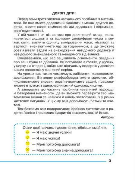 “Посібник створено відповідно до Державного стандарту початкової освіти та Типової освітньої програми, розробленої колективом авторів під керівництвом О. Я. Савченко. У виданні передбачено формування математичних компетентностей та застосування їх у житті, поєднано математичну галузь із літературною, мистецькою, природознавчою, громадянською, соціальною та здоров’язбережувальною. Посібник складається із 3-х частин і має гриф Міністерства освіти і науки України.”