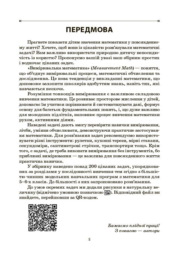 Посібник містить оригінальні авторські задачі, упорядковані за розділами у послідовності вивчення тем згідно з більшістю чинних модельних навчальних програм з математики для 5-х та 6-х класів.