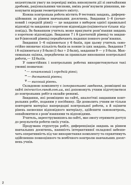 Для організації тематичного і підсумкового контролю подано контрольні роботи, за допомогою яких перевіряється рівень засвоєння учнями навчального матеріалу за кожною темою. Усі роботи наведено в чотирьох варіантах. Завдання самостійних і контрольних робіт диференційовані за рівнями навчальних досягнень учнів.