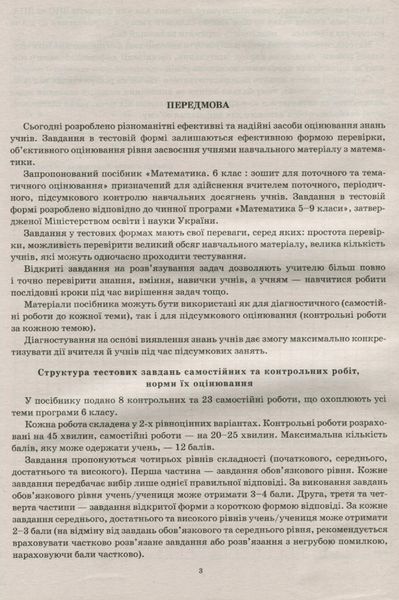 Робочий зошит укладено відповідно до нової навчальної програми з математики, затвердженої Міністерством освіти і науки України. Мета створення цього посібника не тільки допомогти вчителеві провести усі тематичні роботи протягом року, але й в ході вивчення теми, завдяки самостійним роботам, виявити рівень підготовки учня з пройденого матеріалу. Зошит може бути корисним і як підготовка до складання ДПА та ЗНО, оскільки містить типові види завдань як для атестації, так і для оцінювання. Зошит розрахований на учнів загальноосвітніх навчальних закладів та вчителів математики