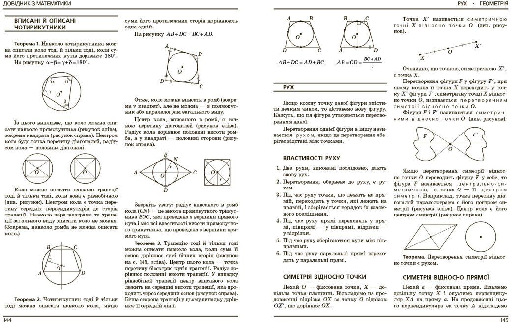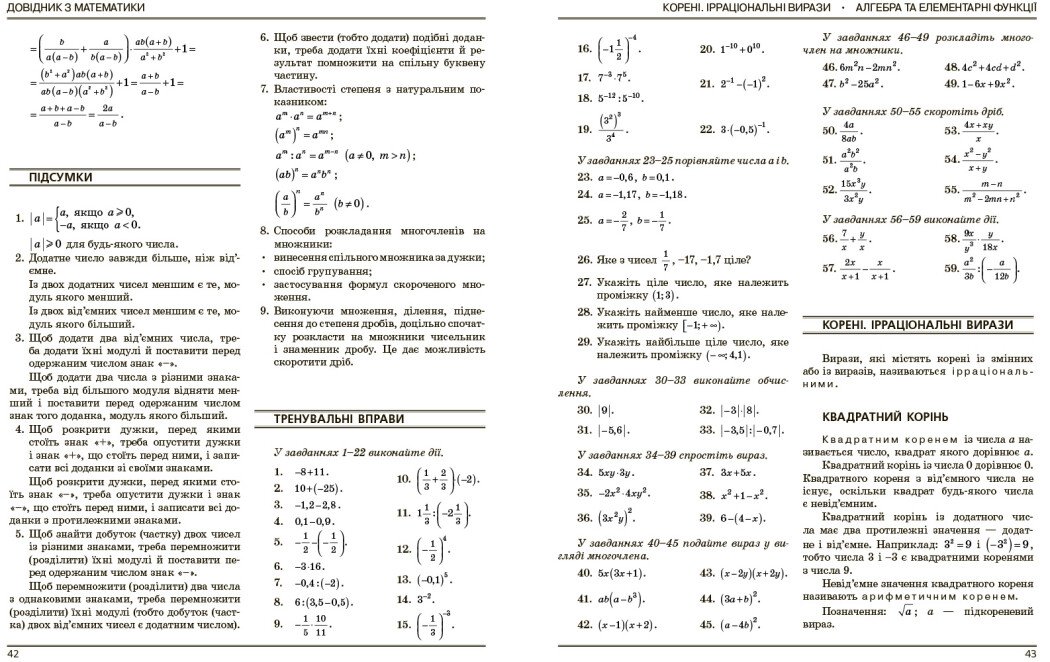 Видання являє собою довідник, який охоплює весь шкільний курс математики. До кожної теми наведено короткі підсумки і тренувальні вправи, а також відповіді до вправ. Посібник допоможе системно оновити та поглибити знання з математики.