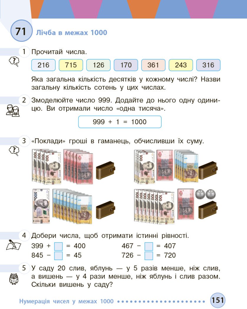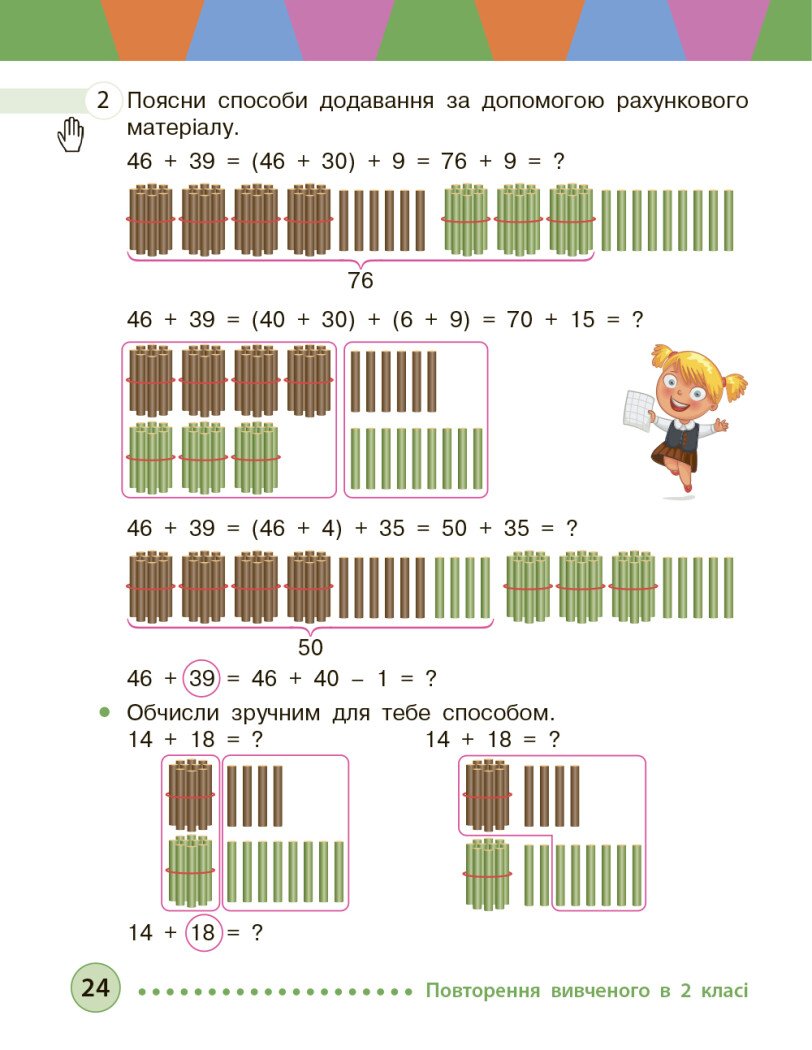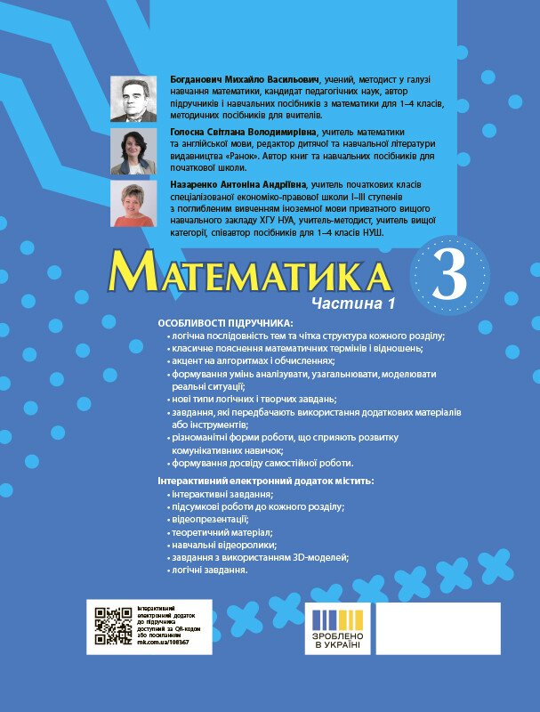 Основою методичного підходу, реалізованого в підручнику, є практична орієнтованість: пропоновані завдання пов’язані з реальним життям дитини, умінням аналізувати, узагальнювати, моделювати реальні ситуації, логічно мислити. Сучасне художнє оформлення навчального видання відповідає віковій категорії третьокласників/третьокласниць, зацікавлює, привертає увагу, доповнює математичну інформацію.