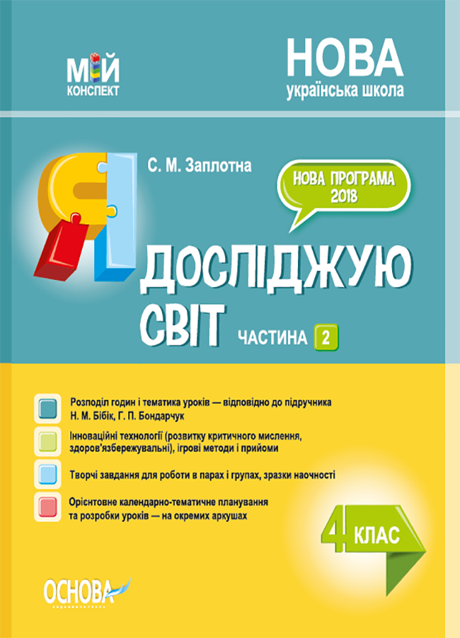 Посібник містить орієнтовне календарно-тематичне планування та розробки уроків інтегрованого курсу «Я досліджую світ» у 4-му класі Нової української школи, складені відповідно до вимог нового Державного стандарту початкової освіти (2018) за Типовою програмою авторського колективу під керівництвом О. Я. Савченко.
