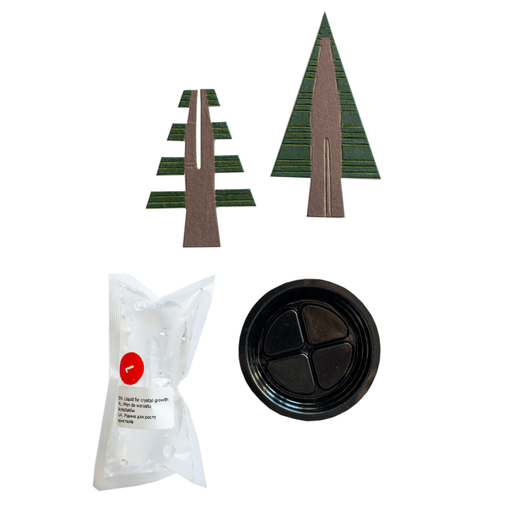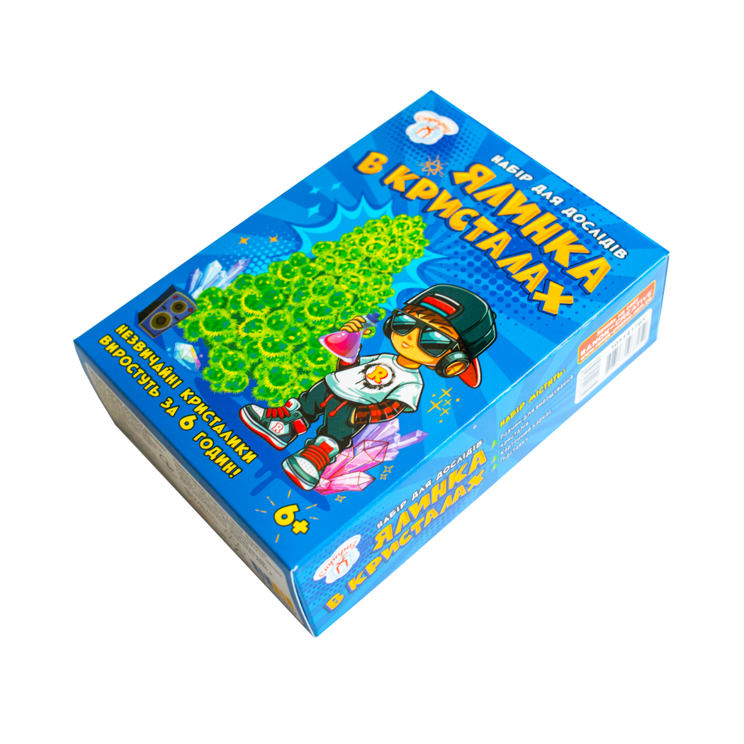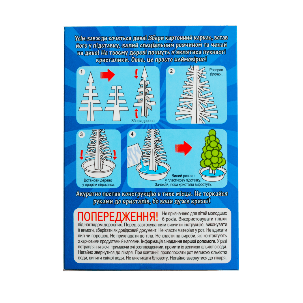 Усього за 6 годин звичайна картонна ялинка перетворюється на чарівну, її гілочки вкриваються яскраво-зеленими кристалами, наче справжньою зимовою магією. Усе дуже просто: розправляємо гілочки, встановлюємо ялинку в підставку, додаємо розчин і починається захопливе перетворення.