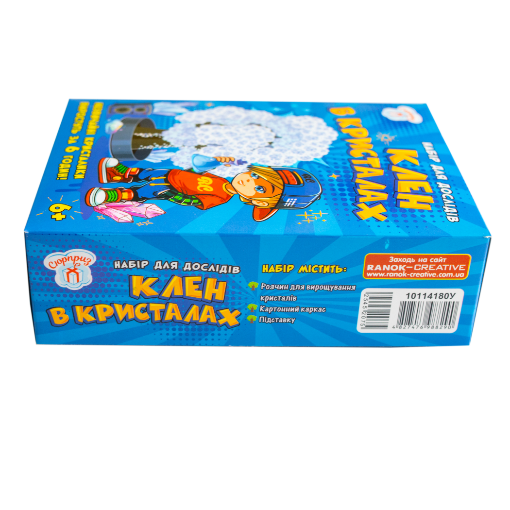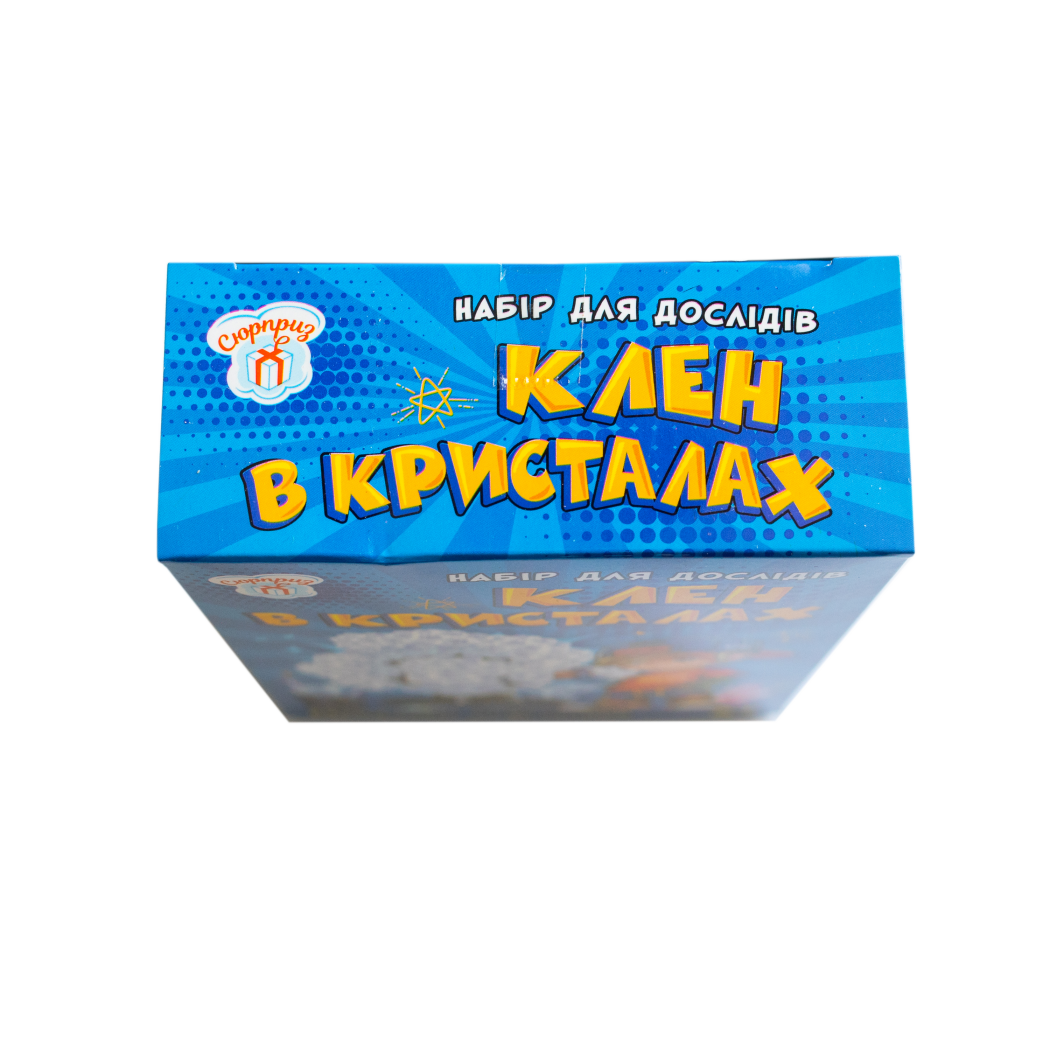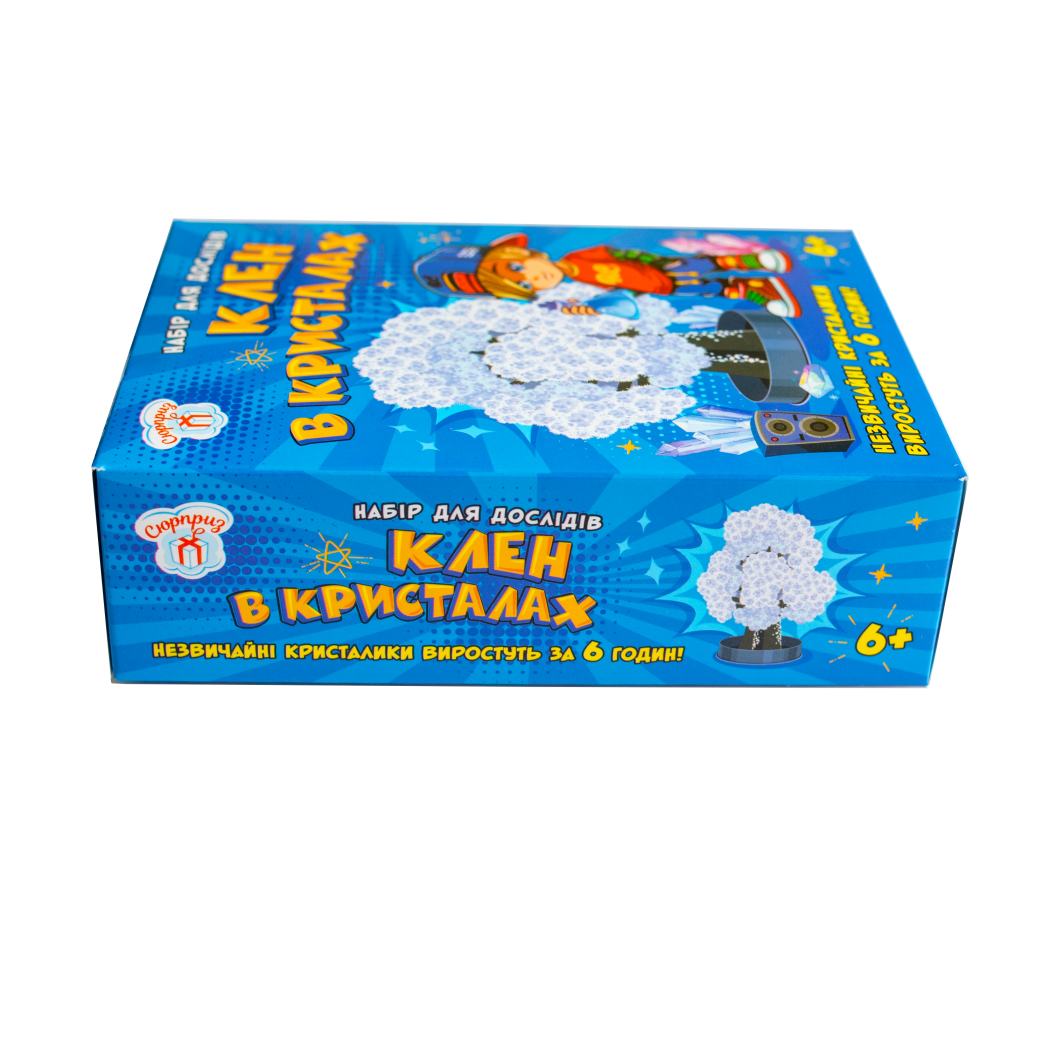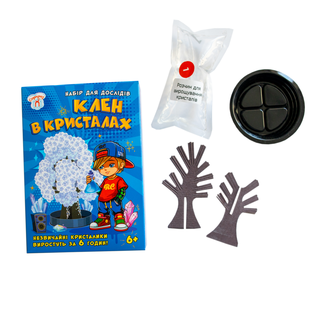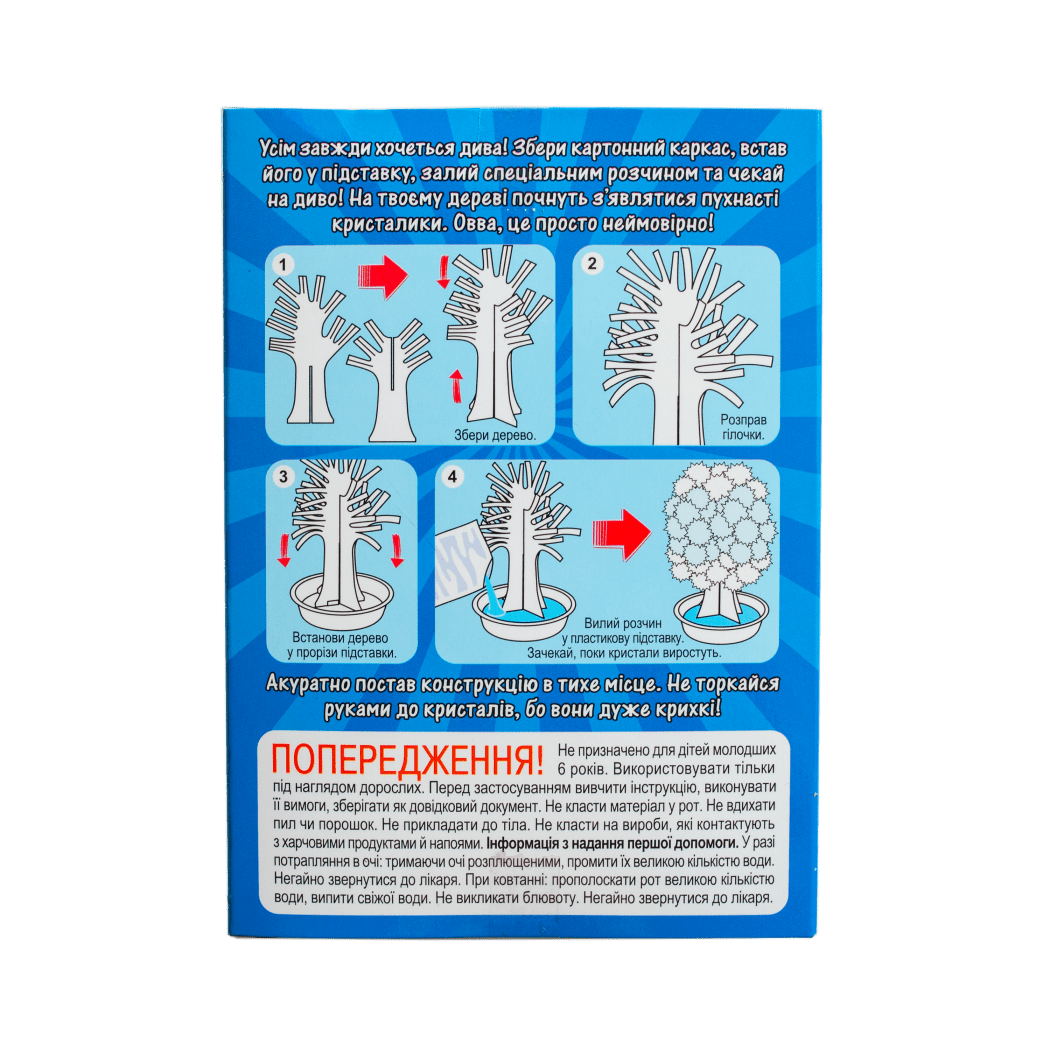 Картонний клен оживає на очах: його гілочки вкриваються сяючими білими кристалами, що переливаються на світлі. Збираєте каркас, ставите дерево в підставку, заливаєте розчин і магія починається!