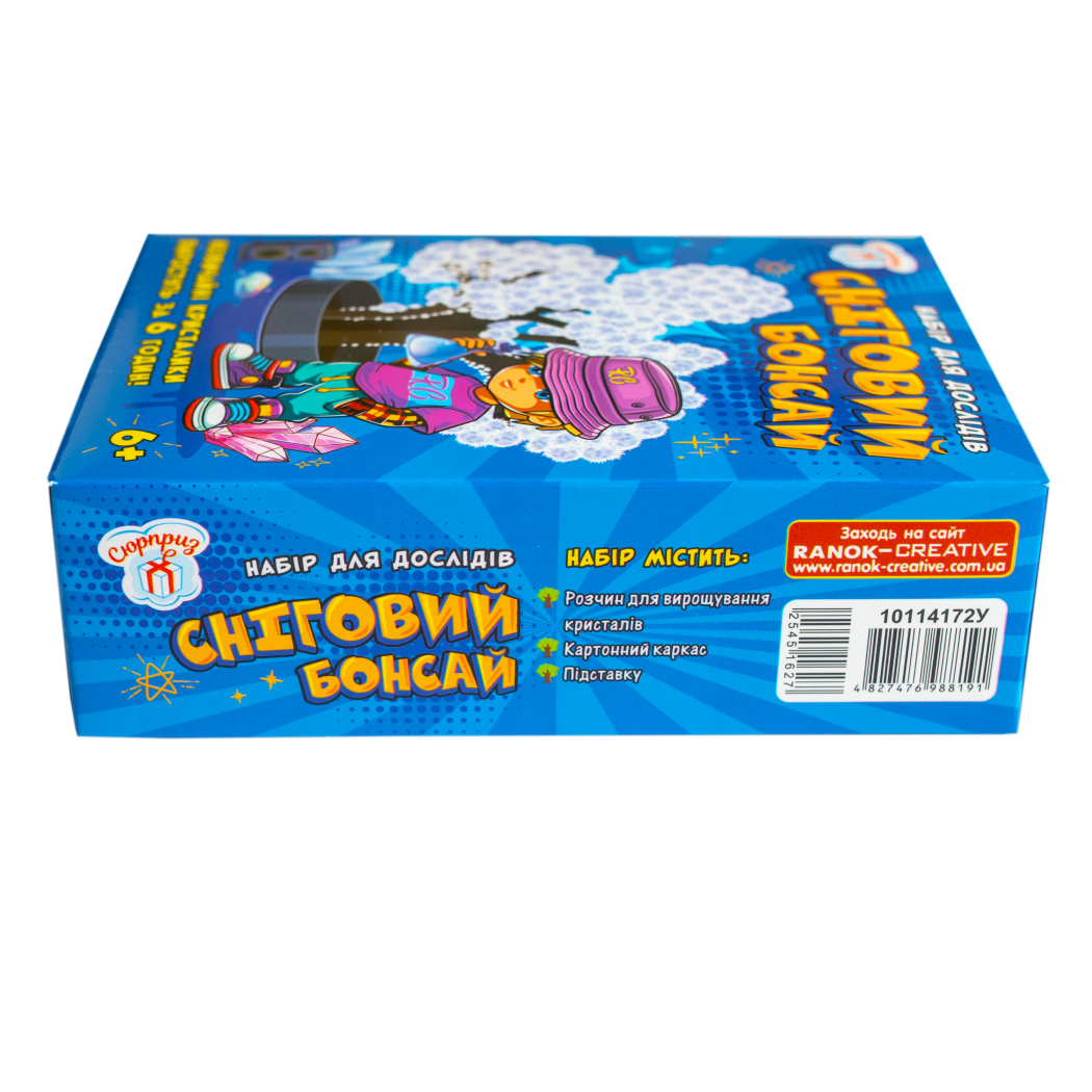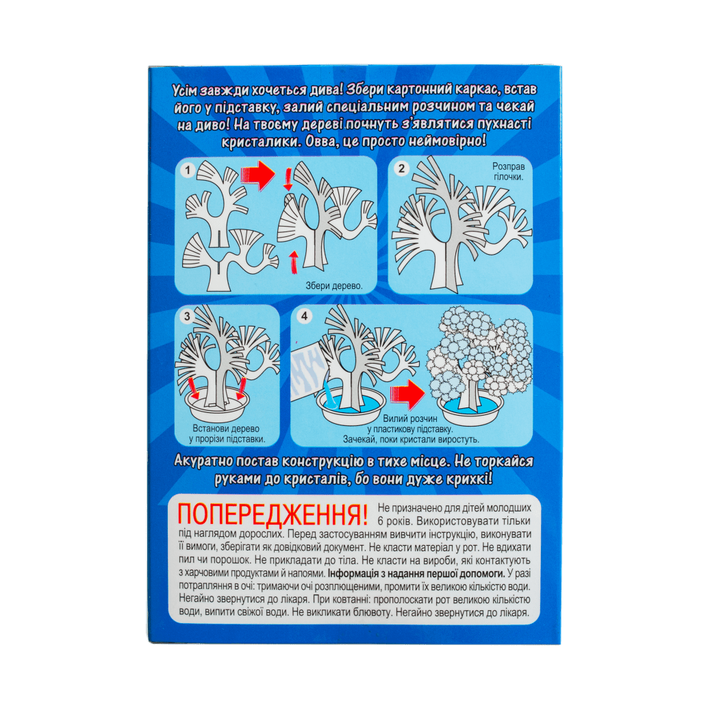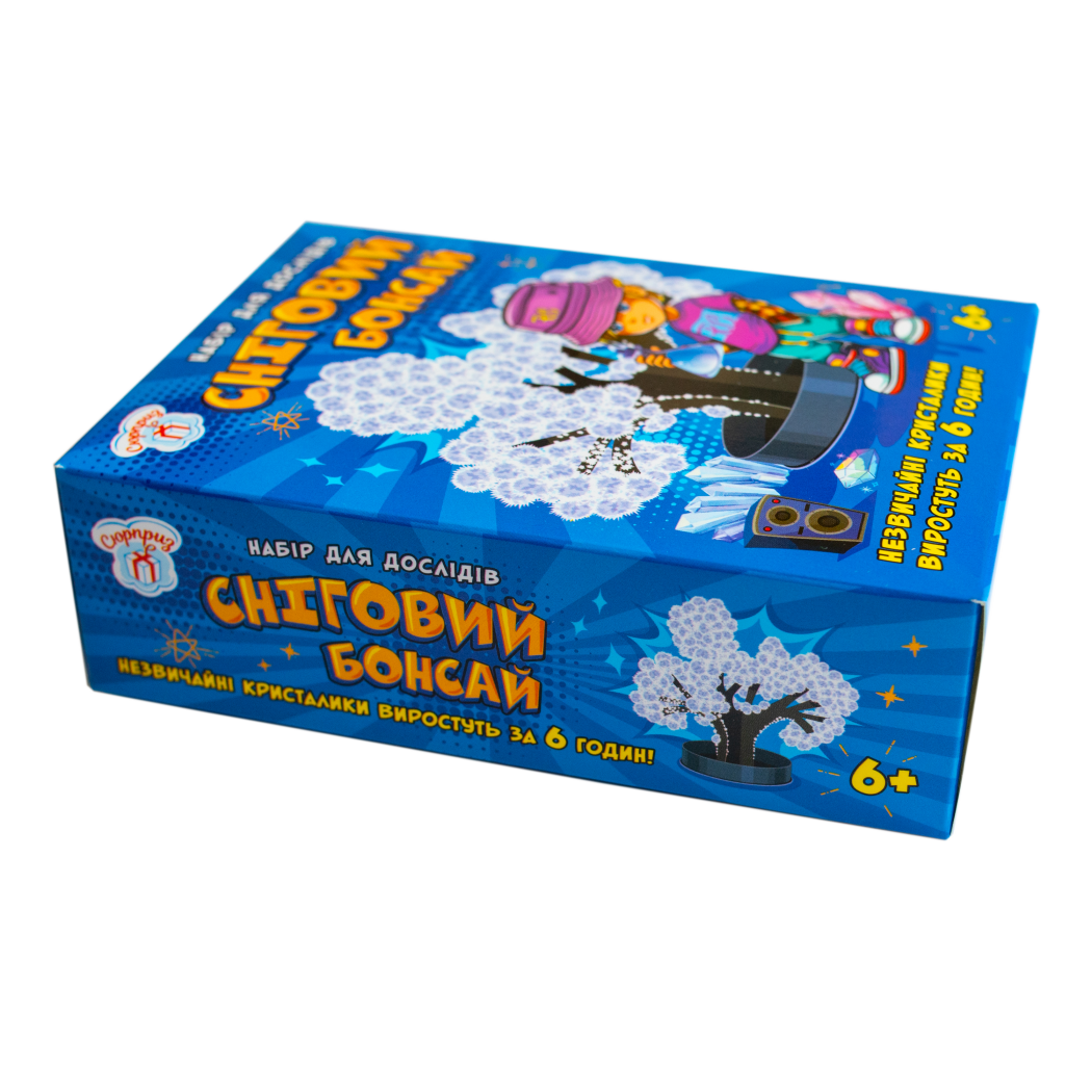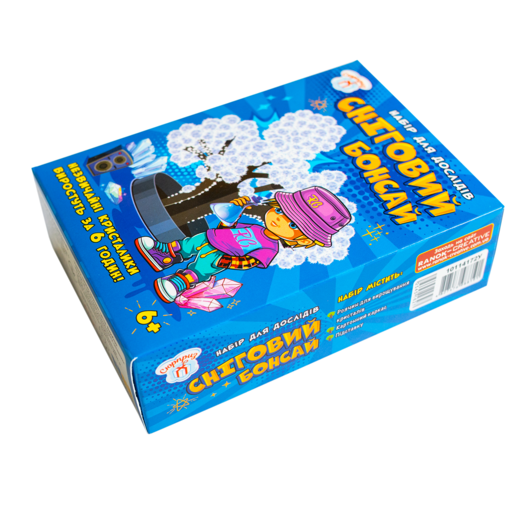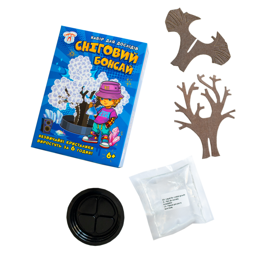 З цим набором звичайний картонний каркас перетвориться на чарівний сніговий бонсай, вкритий пухнастими кристалами. Просто зберіть дерево, встановіть у підставку, залийте розчин і вже за 6 годин гілочки розквітнуть білими крижаними «пелюстками».
