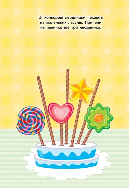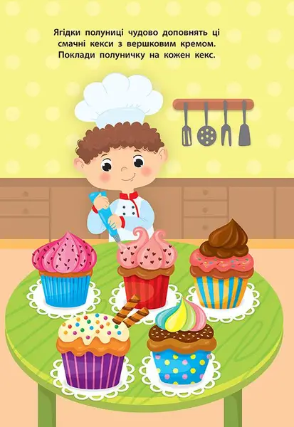 Книжка допоможе малюку весело й пізнавально провести час і відчути себе справжнім кондитером. Виконуючи прості завдання за допомогою наліпок, дитина розвине фантазію, мислення та дрібну моторику пальців рук.