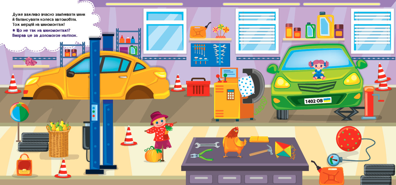 Дітям так подобається шукати та знаходити помилки на картинках. А виправляти їх за допомогою яскравих наліпок — це подвійне задоволення! На кожній сторінці серії «Наліпки-помічниці» діти матимуть змогу: — уважно розглянути картинку; — з’ясувати, що на ній не так; — виправити неточності за допомогою наліпок; — дізнатися цікаву інформацію та творчо її доповнити. Ця книжка допоможе дітям побувати на автомийці й автосервісі, шиномонтажі й станції технічного обслуговування, в автомалярній майстерні, студії автотюнінгу й магазині автотоварів. Захопливі завдання допоможуть розвинути увагу, логічне мислення, уяву та мовлення, а оригінальне оформлення у вигляді смішної плутанини неодмінно зацікавить дитину. Видання сприятиме розвитку уваги, логічного мислення, уяви та мовлення, а також дозволить весело й пізнавально провести час./