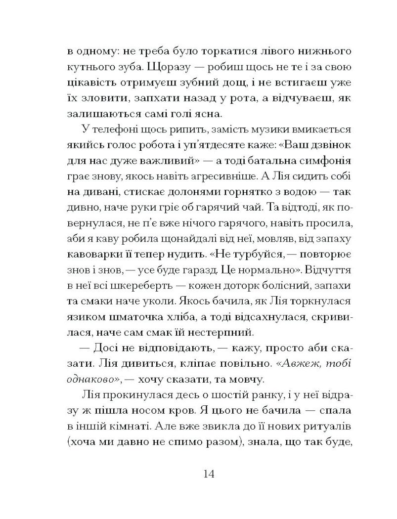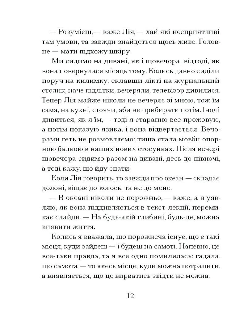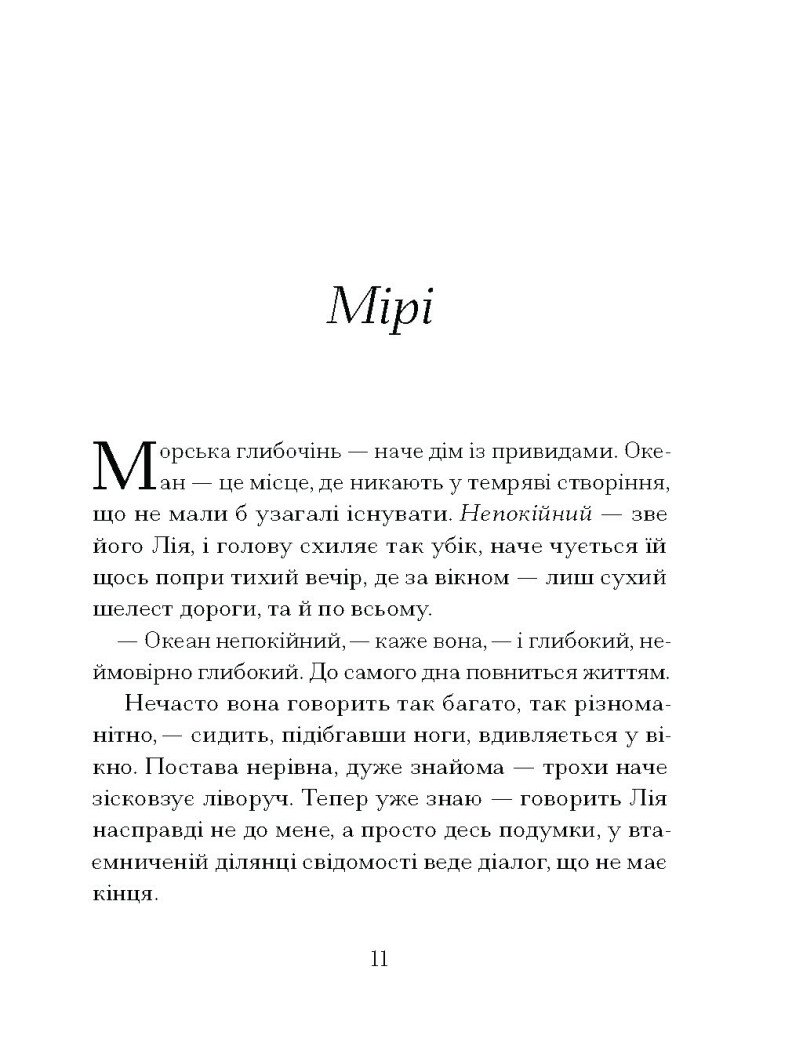 Здається, в такі моменти вона роздумує, зануритись туди чи ні, хоча іноді на обличчі проступає тривога — ніби довго вдивлялася в глибочінь і тепер не може звідти вирватися…».