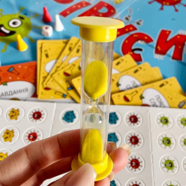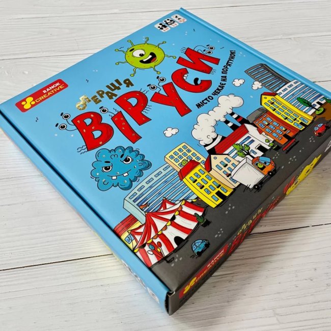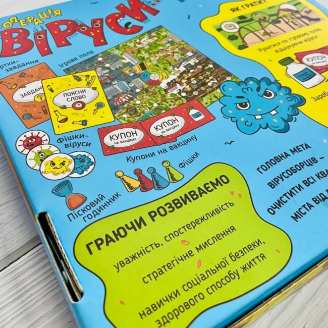 Гра містить: картки-завдання, ігрове поле, фішки-віруси, купони на вакцину, детальні та зрозумілі правила гри + словничок наукових термінів.