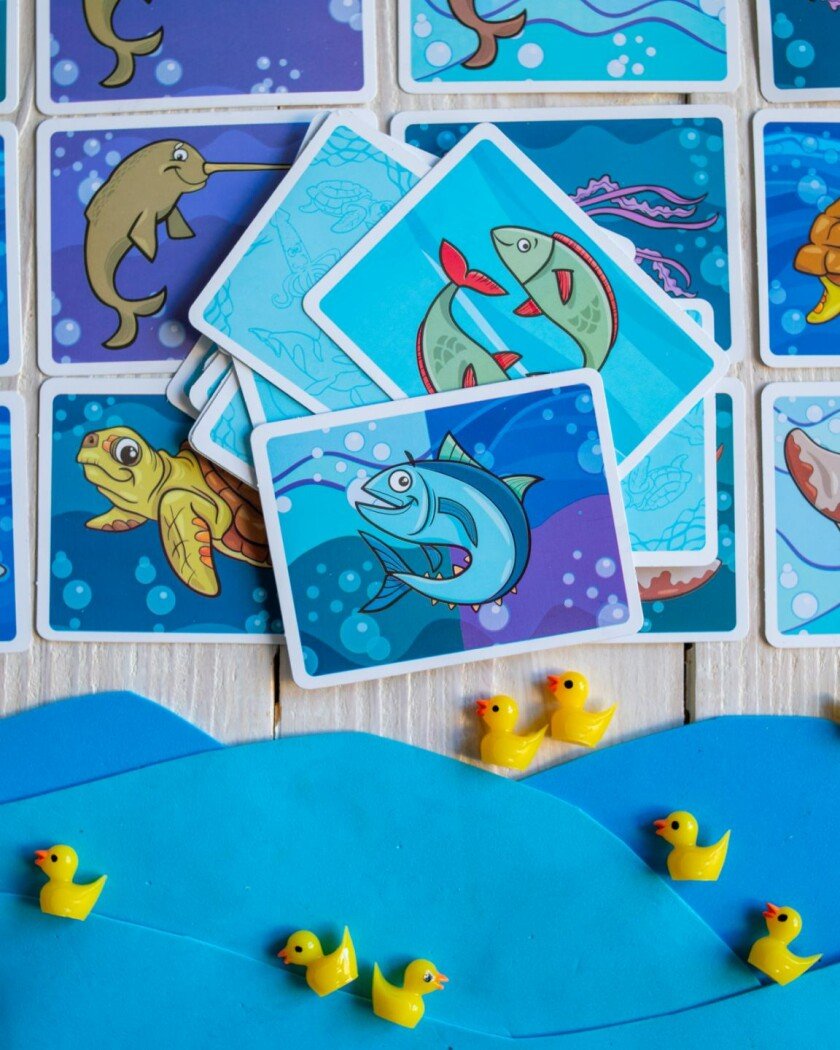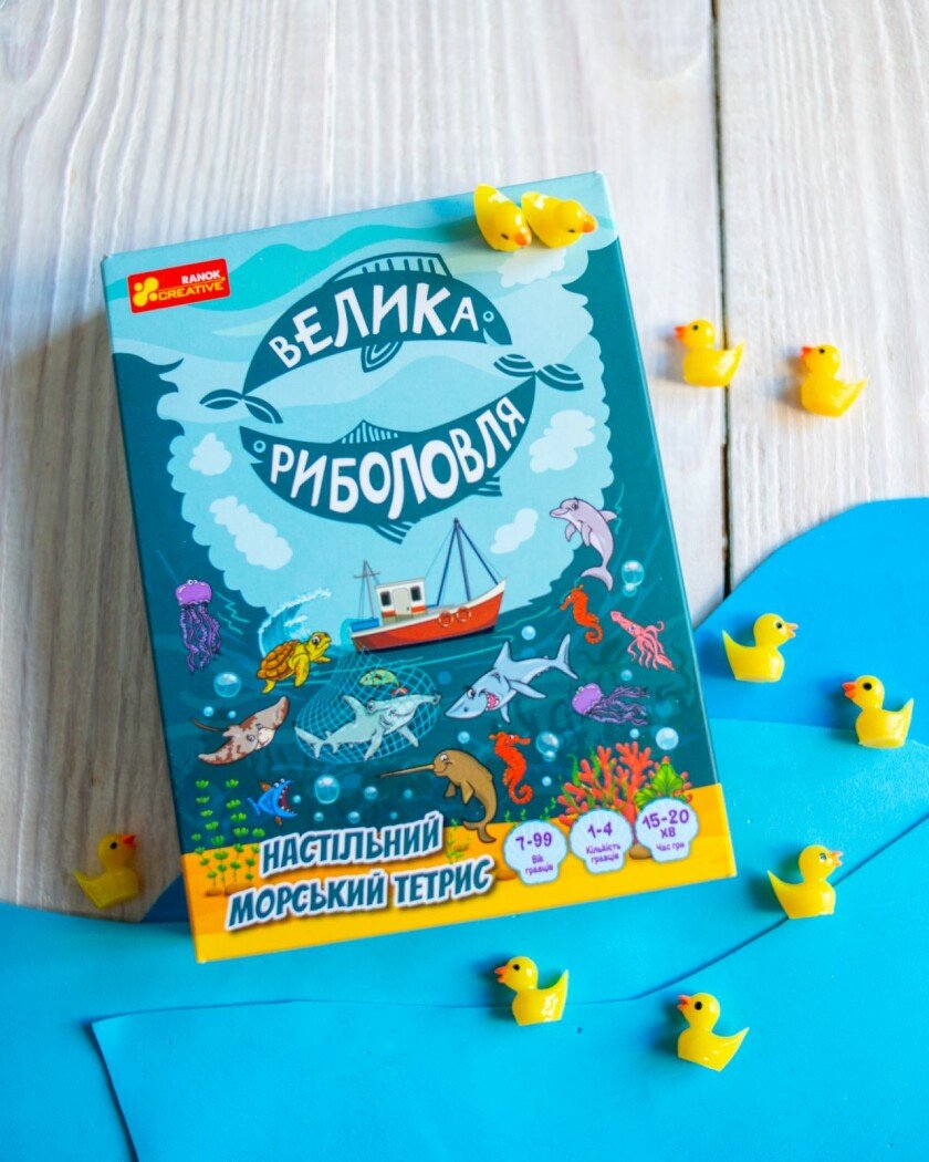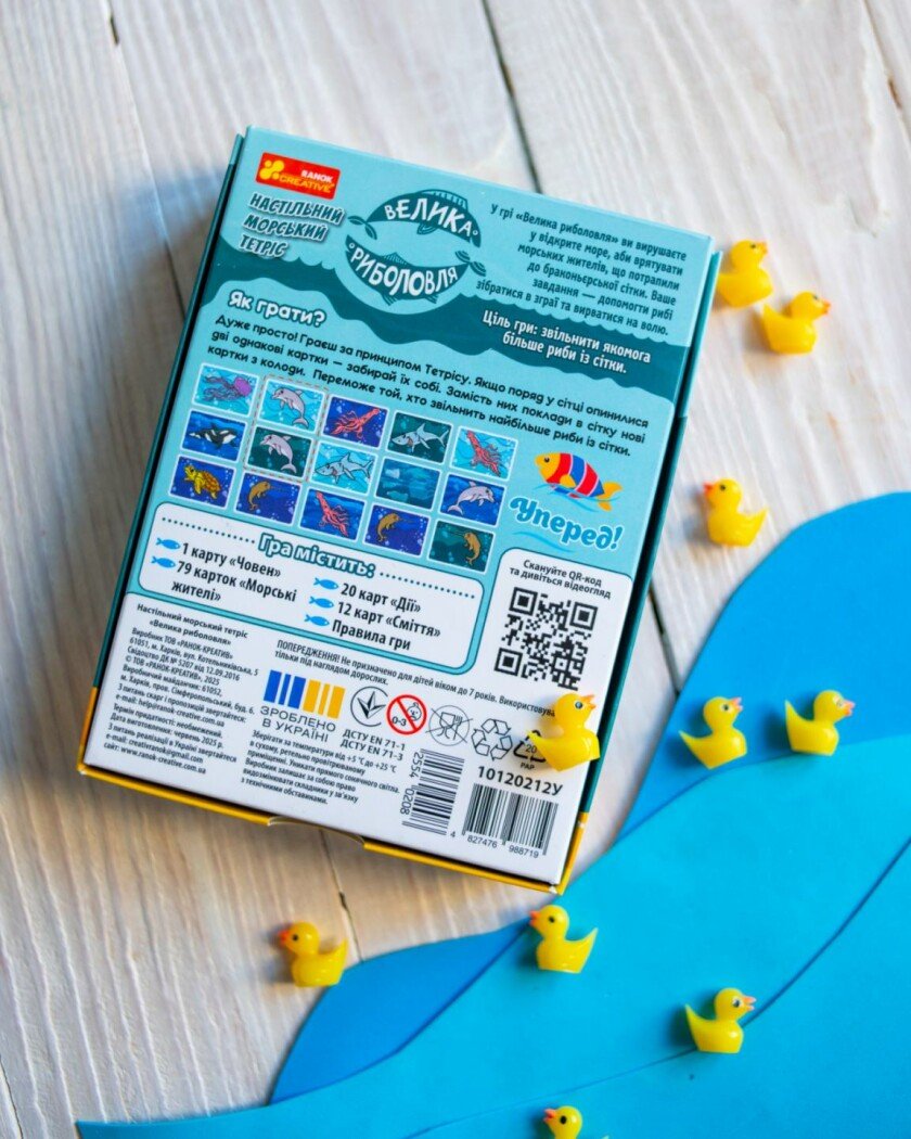 Врятуй мешканців океану з браконьєрської сітки у грі «Велика риболовля»! Це яскрава настільна гра в стилі тетрісу для 1–4 гравців від 7 років. Складай зграї з однакових морських тварин, застосовуй їхні суперздібності, прибирай сміття і спостерігай, як карти «падають» у сітку — як у тетрісі! Грай на швидкість, логіку й кмітливість.
