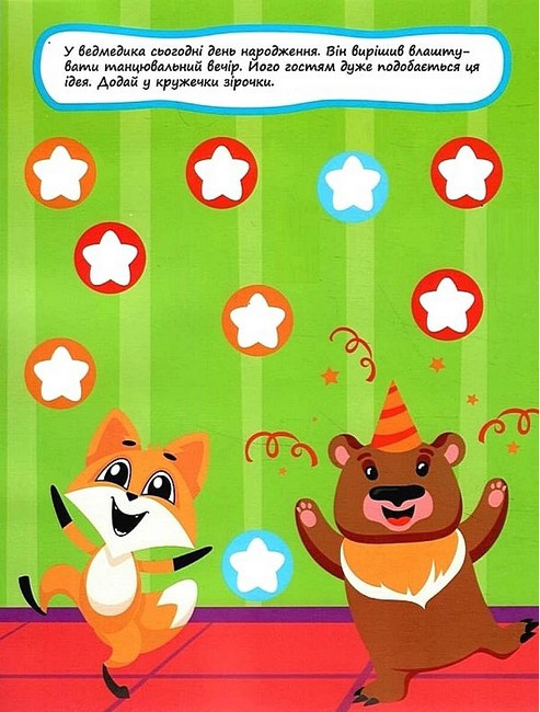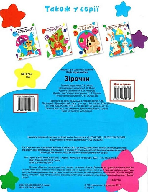 Книжка «Зірочки» призначена для творчих, активних діточок. Доповнюючи кумедні малюнки наліпками-зірочками, ваш малюк не тільки отримає задоволення від захопливої гри, а ще й проведе час із користю. Адже ігри з наліпками розвивають просторове та логічне мислення, зорове сприйняття, посидючість, а також тренують дрібну моторику. Якщо малюк не зможе охайно приклеїти зірочку одразу – не проблема, адже наші наліпки – багаторазові!