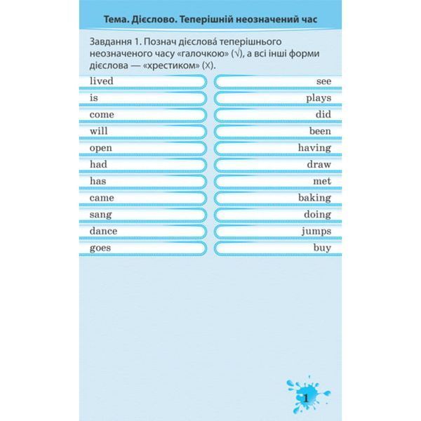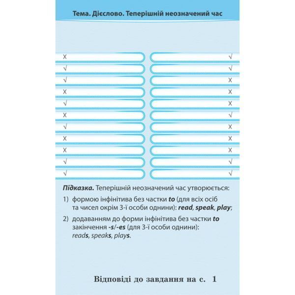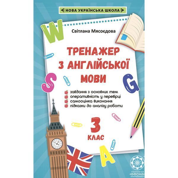 Тренажер з англійської мови для 3 класу — це посібник з новаторським підходом до перевірки знань та самоперевірки учнів — стане у нагоді на початку уроку для перевірки раніше вивченої теми, або в кінці уроку — для перевірки рівня засвоєння нової теми. У посібнику представлено 16 тем. Завдання до тем підібрано відповідно до програми. Новаторський метод перевірки та самоперевірки знань пояснено перед завданнями у правилах користування тренажером. Після тем є підказки-правила, перечитавши які, можна заповнити прогалини у знаннях і перевірити свої знання ще раз. Тренажер- це: завдання з основних тем; оперативність у перевірці; самооцінка виконання; підказки до аналізу робіт.
