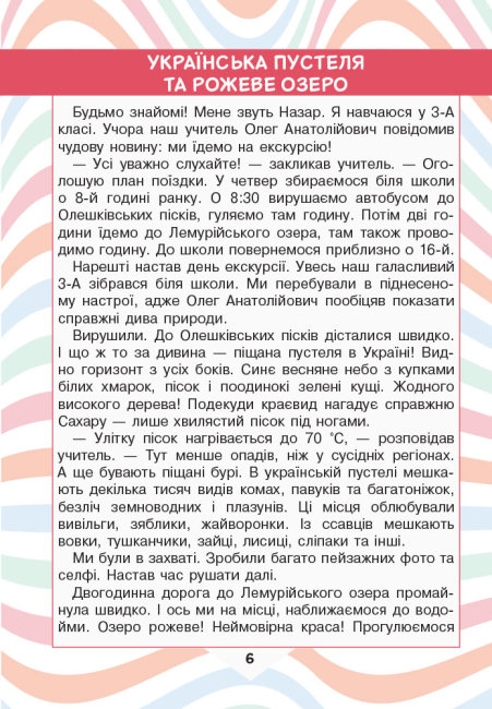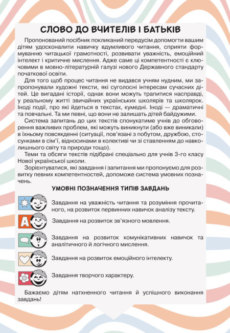 У посібнику вміщено тексти, які допоможуть дітям удосконалити навичку вдумливого читання, сприятимуть формуванню читацької грамотності, розвиватимуть уважність, емоційний інтелект і критичне мислення. До кожного тексту подано систему запитань різного рівня складності.