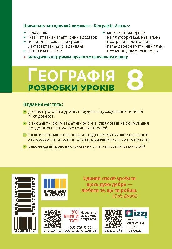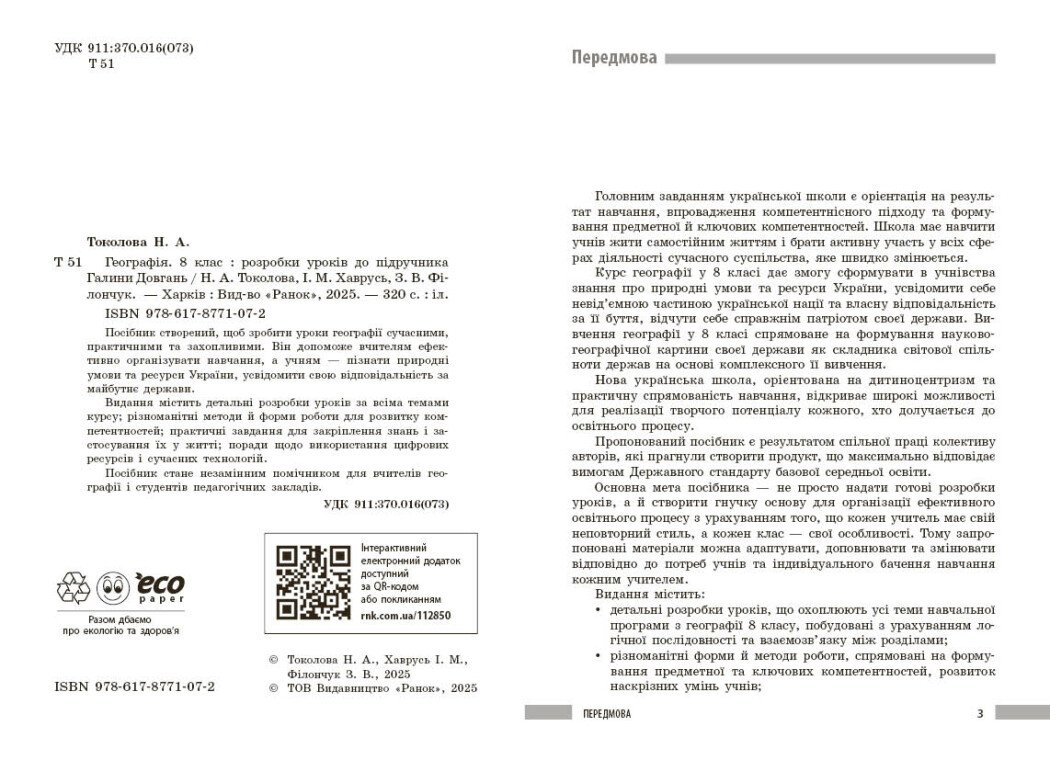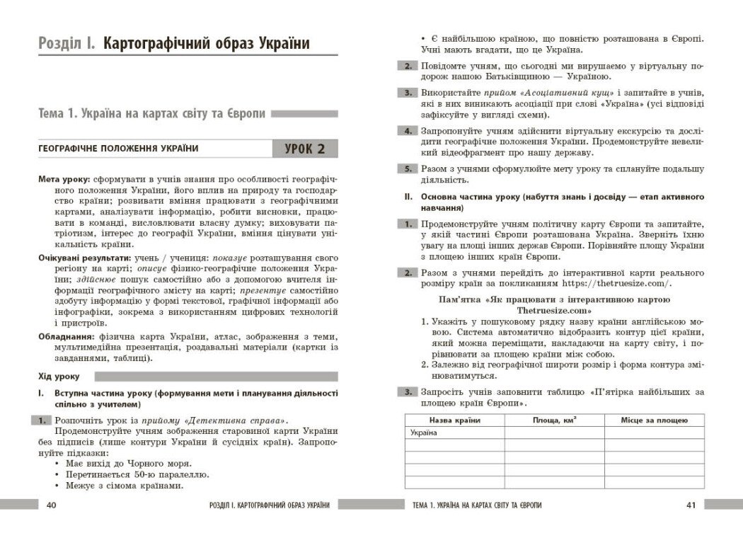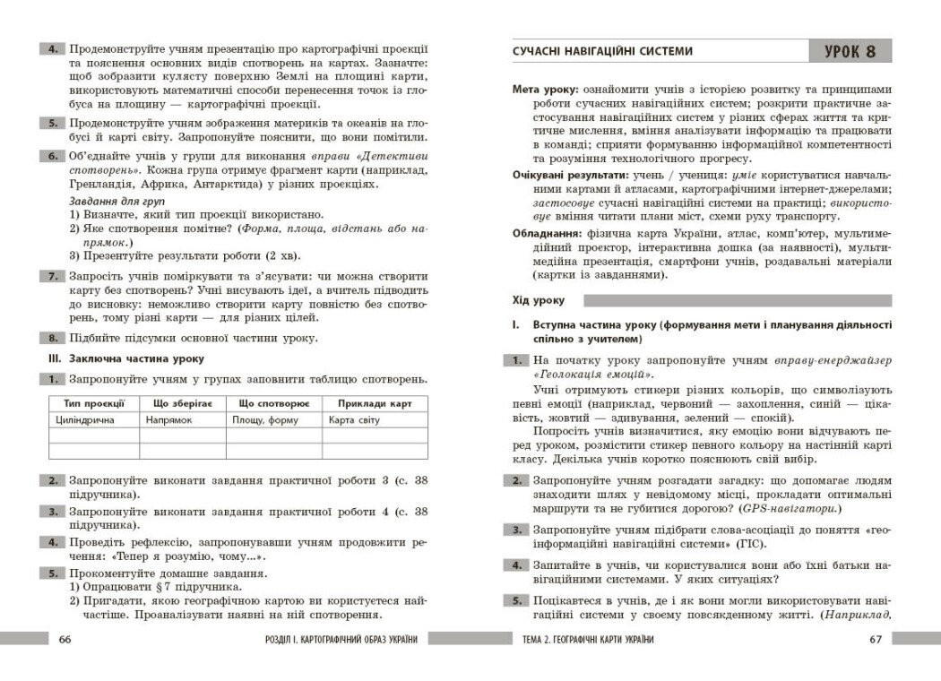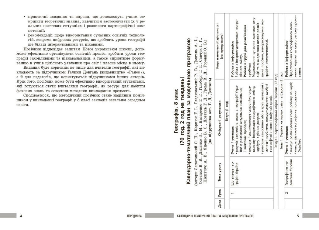 Курс географії у 8 класі дозволяє сформувати в учнівства знання про природні умови та ресурси України, усвідомити себе невід’ємною частиною української нації та власну відповідальність за її буття, відчути себе справжнім патріотом своєї держави. Ви- вчення географії у 8 класі спрямоване на формування науково-географічної картини своєї держави як складника світової спіль- ноти держав на основі комплексного її вивчення.