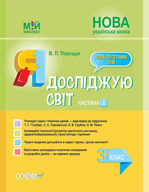 Посібник містить орієнтовне календарно-тематичне планування та розробки уроків інтегрованого курсу «Я досліджую світ» у 3-му класі Нової української школи, складені відповідно до вимог нового Державного стандарту початкової освіти (2018) за Типовою програмою авторського колективу під керівництвом О. Я. Савченко.