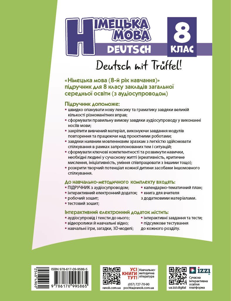 Підручник створено для 8 класу НУШ відповідно до модельної навчальної програми «Іноземна мова 5-9 класи» для закладів загальної середньої освіти (авт. Редько В. Г. та ін.) з урахуванням реалізації ключових компетентностей. Видання ґрунтується на компетентнісному, комунікативному, діяльнісному й особистісно орієнтованому підходах та враховує сучасні методики викладання іноземних мов у школі.