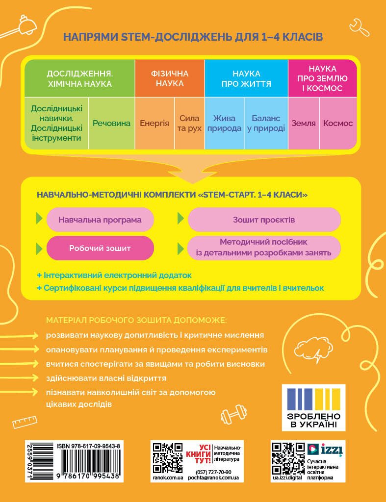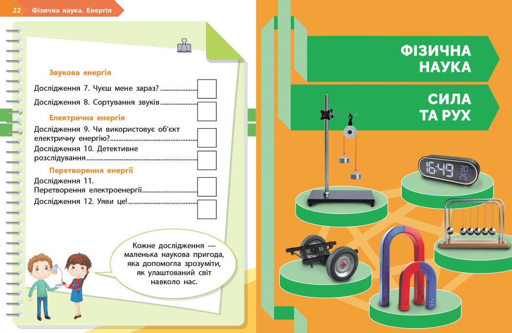 Зошит є складовою навчально-методичного комплекту «STEM-старт». Посібник розроблено з метою формування базових дослідницьких навичок та ознайомлення з основами фізики як природничої науки. Учні й учениці дізнаються, що таке енергія, де її можна знайти, як світло й тепло змінюють наш світ і як усе навколо потребує енергії, щоб рухатися чи жити. Вони будуть шукати джерела енергії у класі та вдома, дізнаються, чому Сонце важливе, а також як змінюється тепло.