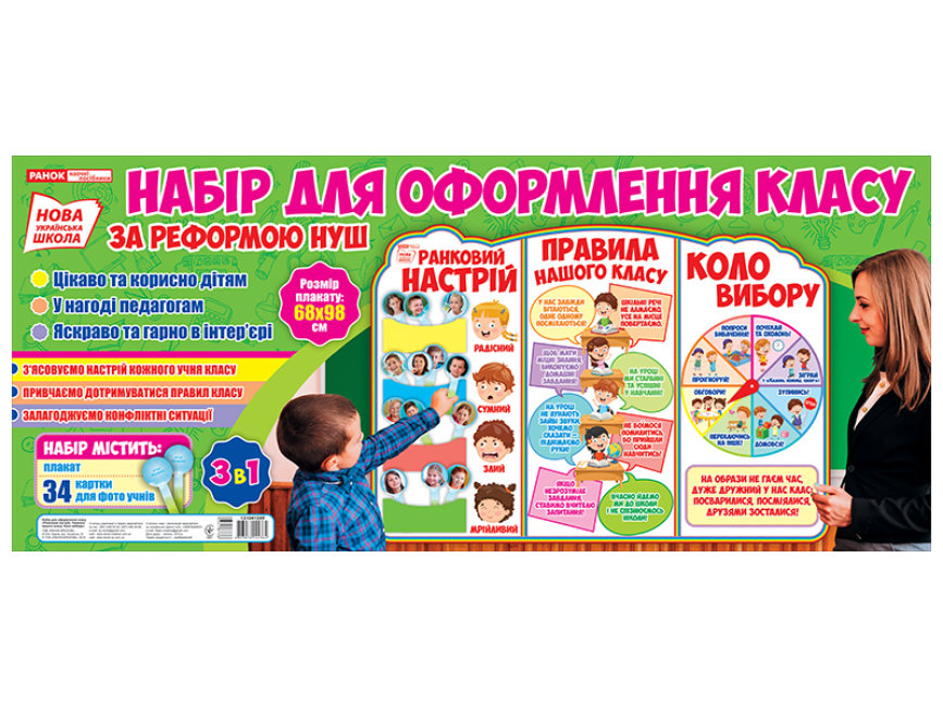 Стенд «Ранковий настрій. Правила нашого класу. Коло вибору» — це повноцінний класний куточок в одному наборі. Наявність такого плакату в класі рекомендовано реформою НУШ. Стенд стане яскравим оздобленням інтер’єру, помічником для вчителів і другом для дітей. Завдяки стенду можна з’ясувати настрій кожного учня. Для цього дитина бере свою картку з фото (яка входить до складу набору) і ставить її у відповідну до свого настрою кишеню. Також на стенді розміщені правила класу. До них діти можуть звернутися у будь-який момент та дотримуватися впродовж навчання. Ще однією складовою є коло вибору з рухомою стрілкою. Завдяки колу вчитель може залагоджувати конфліктні ситуації в класі
