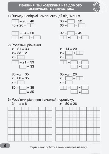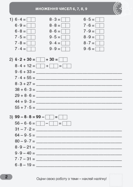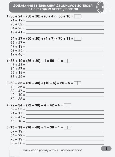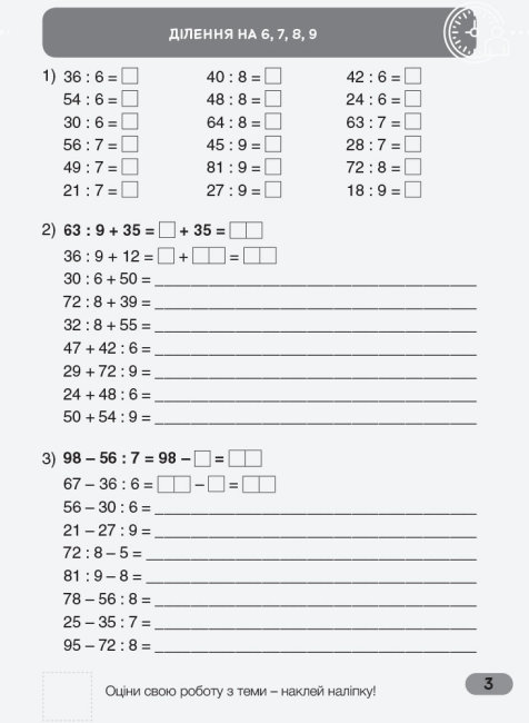 Регулярна робота з цим посібником допоможе учням 3 класу автоматизувати обчислювальні навички, стати більш уважними і самостійними. Посібник призначений передусім для тренування, а тому тут не передбачено вправляння у каліграфічному написанні чисел — переважно замість клітинок для запису використано лінії. Окрім того, ми пропонуємо способи виконання виразів і даємо зразки (виділено напівжирним). Таким чином дорослі можуть перевірити хід виконання завдань учнями і, якщо була допущена помилка, разом виправити. А далі учні вправляються в обчисленні з урахуванням набутого ними досвіду.