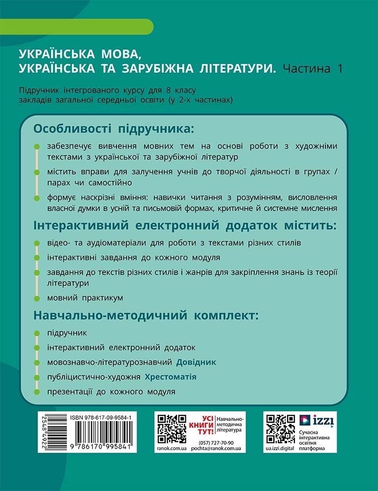 НУШ Українська мова, українська та зарубіжна літератури. 8 клас. ЧАСТИНА 1 (в 2х ч.). Інтегрований курс. Підручник