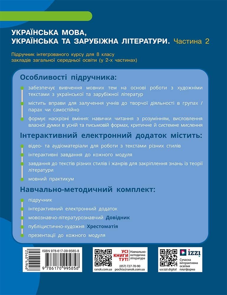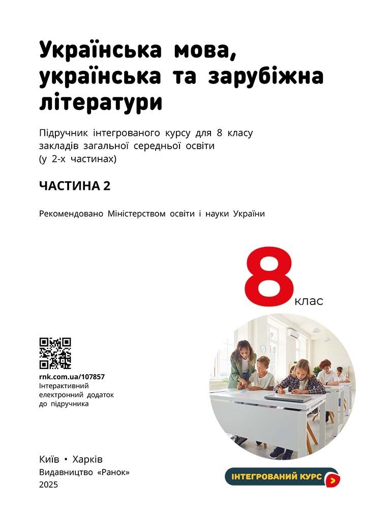 НУШ Українська мова, українська та зарубіжна літератури. 8 клас. ЧАСТИНА 2 (в 2х ч.). Інтегрований курс. Підручник