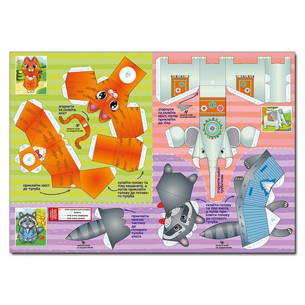 Подивіться на схеми та зразки. Обережно виріжте за контуром та склейте всі частинки, як написано в інструкції. Ви отримаєте маленьких тваринок, автомобілі, будиночки. А коли склеїте фішки з кубиком, то зможете погратися з друзями у настільну гру, яку знайдете на звороті обкладинки.Бажаємо успіхів у створенні дива!