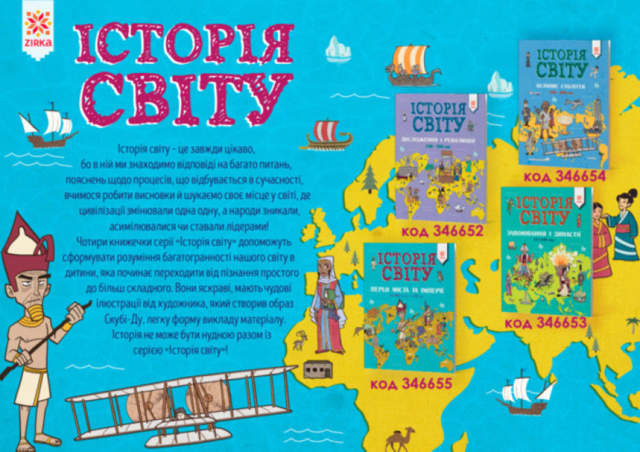 Історія світу – це завжди цікаво, бо в ній ми знаходимо відповіді на багато питань, пояснень, вчимося робити висновки й шукаємо своє місце у світі, де цивілізації змінювали одна одну, а народи зникали, асимілювалися чи ставали лідерами! Чотири книжечки серії «Історія світу» допоможуть сформувати розуміння багатогранності нашого світу в дитини, яка починає переходити від пізнання простого до більш складного. Вони яскраві, мають чудові ілюстрації від художника, який створив образ Скубі-Ду, легку форму викладу матеріалу. Історія не може бути нудною разом із серією «Історія світу»! Збери всі книги серії!