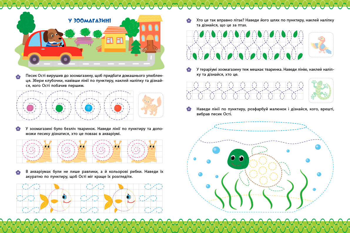 Це видання допоможе дитині швидко й легко пробудити та підтримати інтерес до письма, адже створене з урахуванням психології дитини. Прописи складаються із захопливих історій про пригоди тварин, які потрібно доповнити спіральками, зигзагами, фігурами та наліпками, а також навести по пунктиру та розфарбувати окремі предмети. Таким чином малюк стане активним учасником цікавої гри, захопливих пригод і неймовірних подорожей, а також розвине графічні навички, мислення та мовлення. Видання призначене для спільної роботи дорослих з дітьми від трьох років.