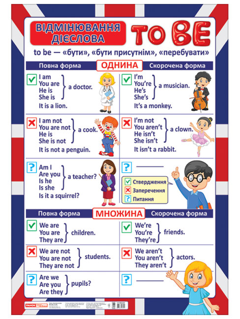 Плакат відмінювання дієслова to be обов’язковий для кабінетів англійської мови. Дуже важливо мати його перед очима на початку вивчення англійської. Знати відмінювання дієслова to be – це практично вивчити основу мови. З цього дієслова починається знайомство й не обходиться жодна розмова. Використовуємо у дитячих садочках, школах і спеціалізованих навчальних закладах або гуртках з англійської.