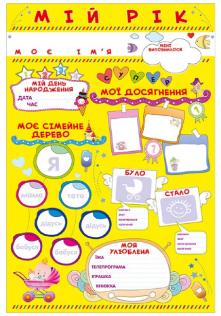 Якщо ви бажаєте оригінально та цікаво розповісти рідним та близьким, як дорослішав ваш малюк протягом року, тоді плакат до дня народження “МІЙ РІК” саме для вас. Просто впишіть ім’я, дані та вподобання, вклейте улюблені фото, і плакат яскраво продемонструє новинки із життя іменинника.