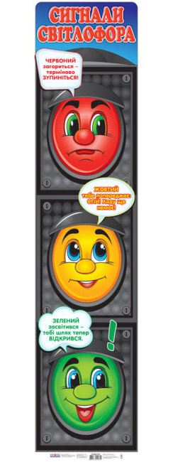 Плакат із цупкого ламінованого картону. Плакат у вигляді світлофору рекомендується для проведення навчальних занять з правил безпеки дорожнього руху у навчальних закладах та знайомства дітей з сигналами світлофору та їх значенням. Яскраві кольори та коментарі до кожного знаку сприятимуть швидкому засвоєнню матеріалу.