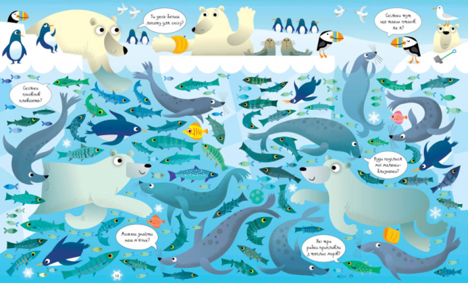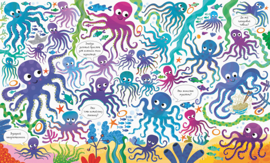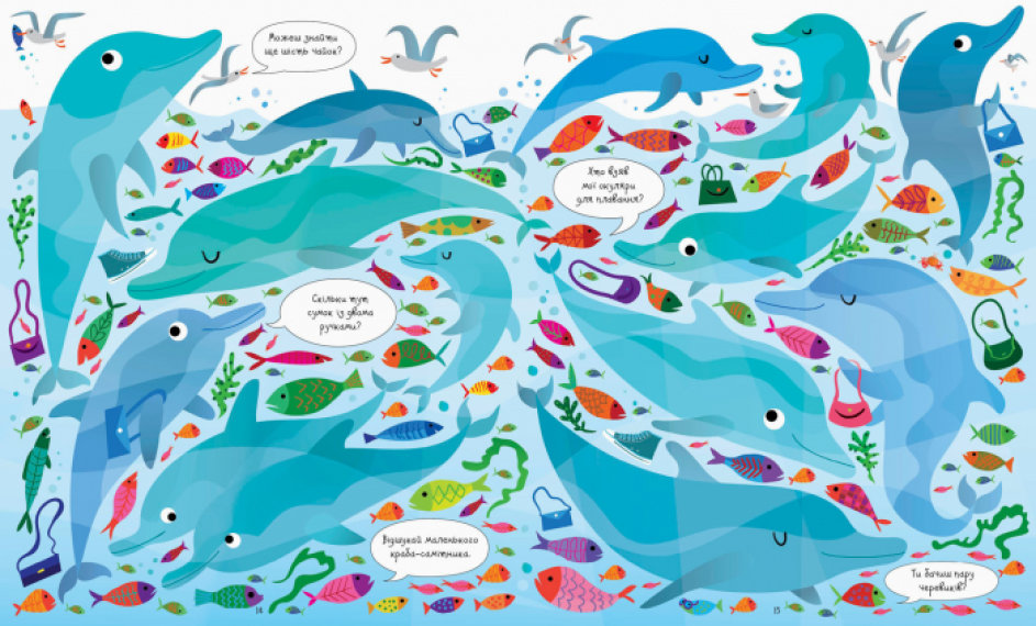 На кожній сторінці цієї ілюстрованої книги — безліч морських мешканців, а також різноманітних предметів та цікавих деталей, які треба знайти, порівняти та порахувати.