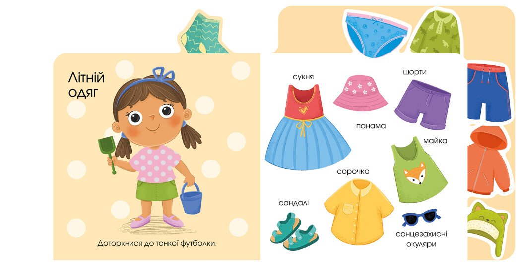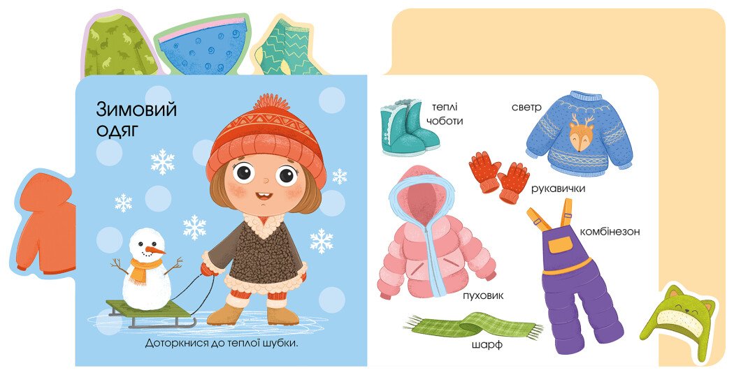 Ця унікальна тактильна книжка допоможе малюку дізнатися про одяг, який ми носимо в різні пори року та вдягаємо для різних занять. Спеціальні вставки дозволять відчути текстуру футболки, піжами, спортивного костюма, дощовика, шуби та допоможуть малюку розвинути моторні навички та сенсорні відчуття.