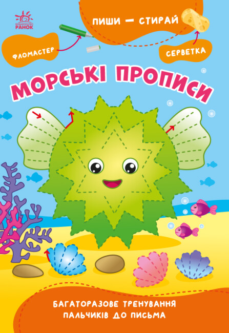 Як прищепити навички письма маленькому дошкільнику? Відповідь проста – перетворивши заняття у гру. Малюк непросто наводить лінії – він допомагає закінчити малюнки. Яскраві сторінки прописів заохотять дитину не тільки розглядати мешканців моря, а й прищеплять їй навички охайного малювання і письма, вміння орієнтуватися по клітинках та впевнено повторювати зразки. А ще дитина не буде боятися помилитися, бо виправити свої недоліки дуже просто – слід витерти й знову спробувати. Для дошкільнят.