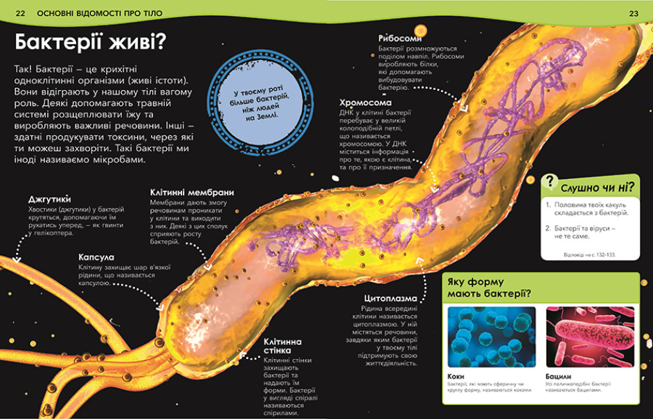Який орган найбільший? Чому цукор на смак солодкий? Як мило вбиває мікробів? Чому кров червона?.. І ще багато запитань про все страшенно цікаве й гарне та надзвичайно кумедне й бридке в нашому тілі. Ви будете щиро вражені сотнями яскравих зображень дрібних органел, клітин, тканин і великих систем — усього того, що робить нас людьми.