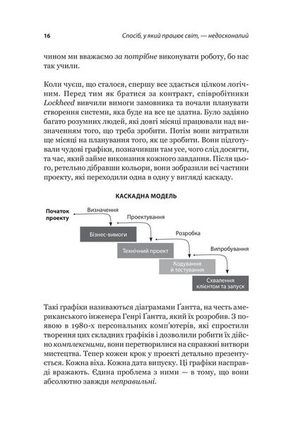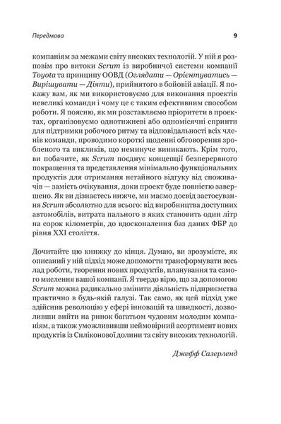 • Книжка входить до Топ-10 Amazon.com • Автор — розробник революційної методики Scrum, яка дозволяє гнучко будувати роботу і підвищує її якість • За 20 років методика допомогла в роботі не тільки фахівцям IT, співробітникам ФБР, бізнесменам, але й звичайним людям У надшвидкому та гіперконкурентному світі ХХІ століття немає місця для марнування — часу, зусиль, ресурсів. Та навіть якщо ви зробите те, що планували, коли планували та вкладетеся в бюджет, може виявитися, що клієнт уже потребує чогось іншого. Адже умови змінюються з небаченою раніше швидкістю… Унікальна методика Scrum руйнує стереотипи старої методики управління проєктами. Її основа — команда, що має надзвичайне почуття мети, самоорганізовується та самоуправляється, а навички її учасників підсилюють одна одну навіть без зусиль з їхнього боку. І, якщо, зробивши крок у нову еру під назвою Scrum, ви не зробили вдвічі більше за половину часу, вам потрібно лише ще раз уважно перечитати цю книгу!
