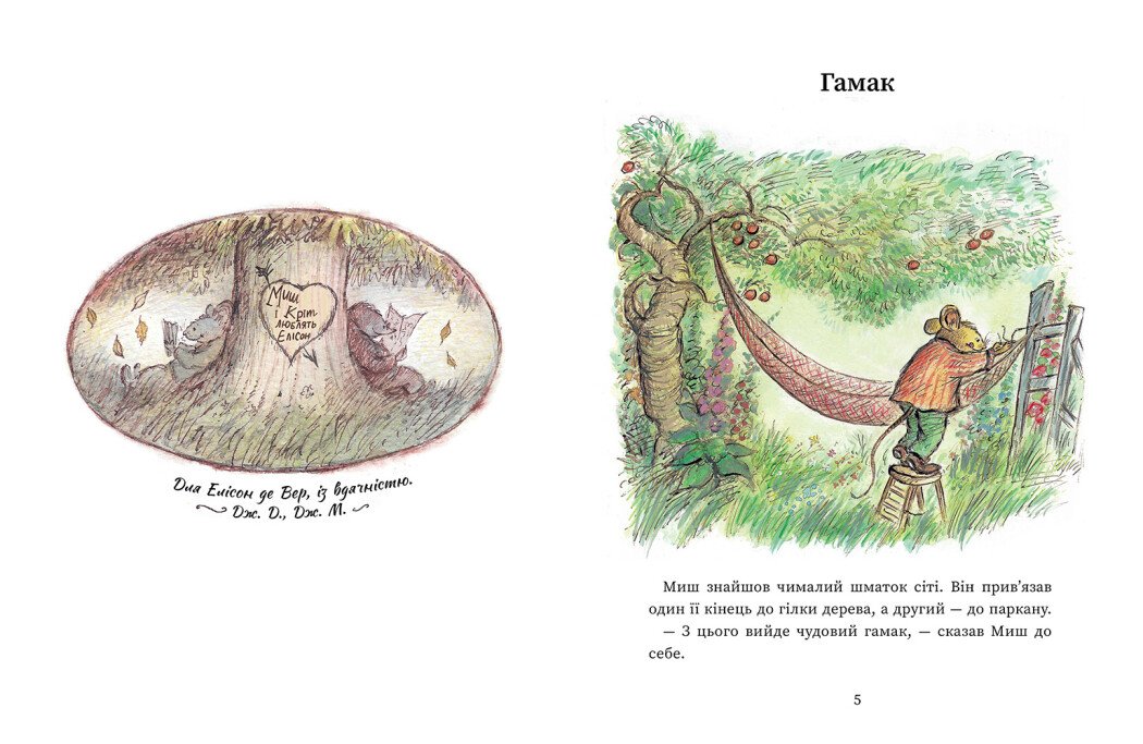 Книжка продовжує серію історій відомої британської дитячої письменниці, авторки багатьох бестселерів Джойс Данбар. Коли Миш робить собі гамак, Кріт радо береться випробувати цю річ для свого друга. А Миш так само з приємністю допомагає другові знайти загублені окуляри. Саме дружба робить звичайні дні щасливими.