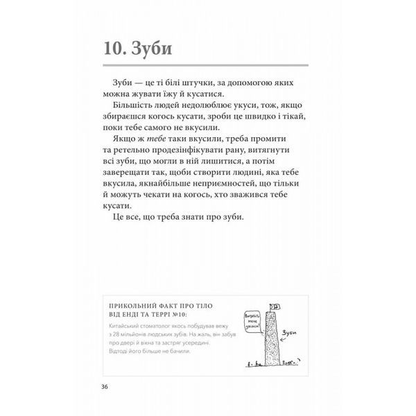 Про людське тіло написано багато дурні, і ця книжка не виняток. 68 ілюстрованих розділів без жодного правдивого факту розкажуть усе, що тобі хотілося б знати про своє тіло, і не втомлять сухою мовою та науковою достовірністю. Ти більше не зволікатимеш із відповіддю, коли хтось підійде, тицьне в якусь частину тіла і запитає: «Що це за орган?». Це все, що треба знати про цю книжку. В Енді Ґріффітса є тіло з 68 робочими частинами. Коли він не пише (руками), він любить читати (очима), думати (мозком), бігати (ногами), плавати (руками й ногами), дихати (носом, трахеєю та легенями), їсти (ротом із зубами, язиком і слиною), перетравлювати їжу (тонкою кишкою, товстою кишкою, жовчним міхуром, підшлунковою залозою, печінкою та селезінкою) і сидіти (на своїй дупі). Це все, що треба знати про Енді Ґріффітса. У Террі Дентона також є тіло. Воно вище, старше і красивіше за тіло Енді. Це все, що треба знати про Террі Дентона.