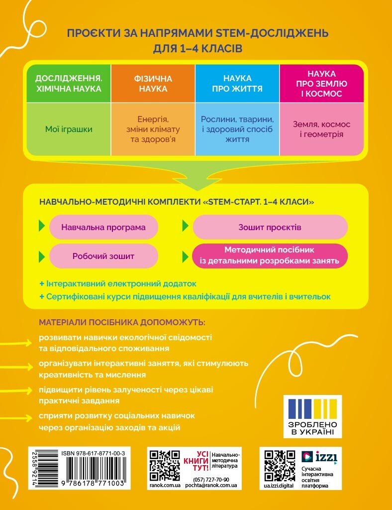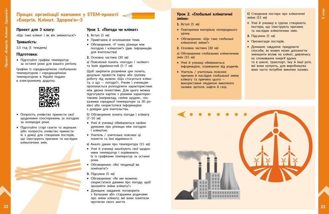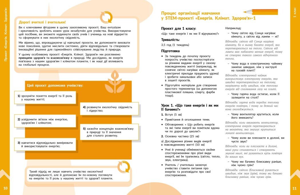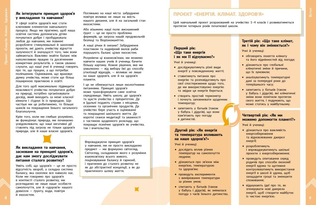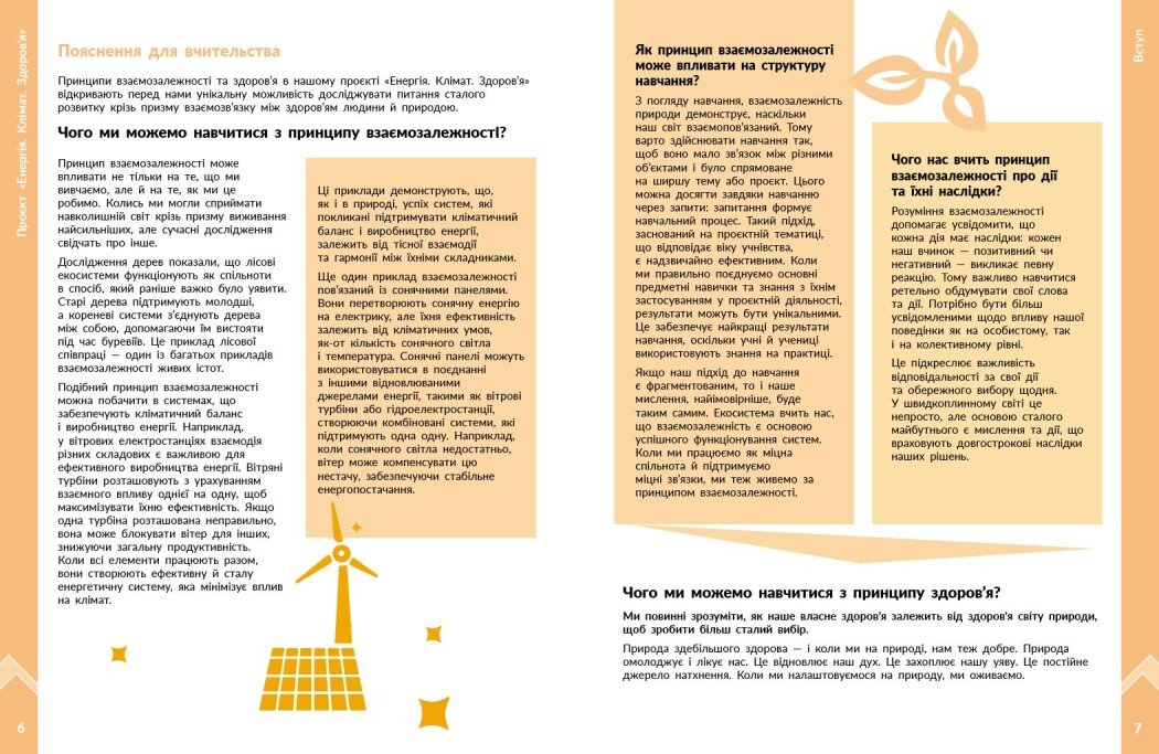 Посібник є частиною навчально-методичного комплекту «STEM-старт», що впроваджує інтегроване навчання на основі принципів Гармонії. Він містить сценарії чотирирічного проєкту, у якому учні й учениці досліджують взаємозв’язки між енергією, кліматом і здоров’ям, формуючи екологічну свідомість та відповідальне ставлення до довкілля.