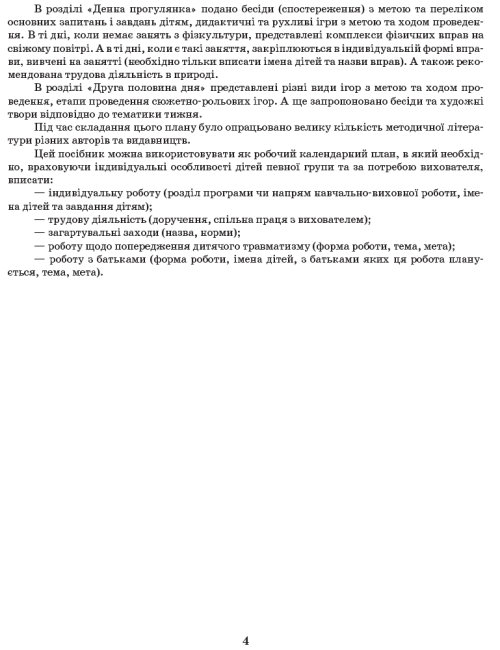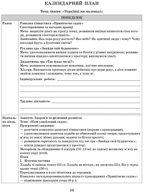 Ці посібники можна використати як робочі календарні плани, в які необхідно тільки вписати: індивідуальну роботу, трудову діяльність, загартовувальні заходи, форми роботи щодо попередження дитячого травматизму та роботи з батьками.