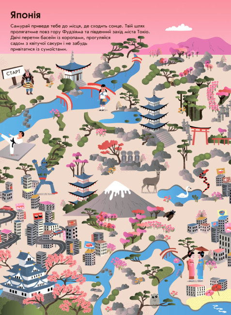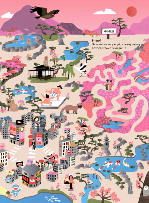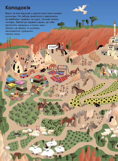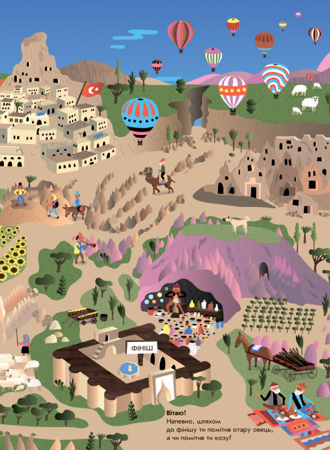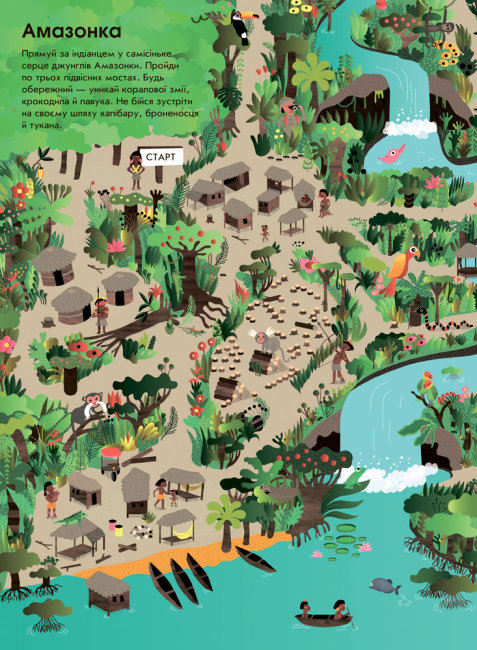 Велика книга віммельбух на картоні із лабіринтами. Кожен лабіринт – нова частина світу. Цікаві підказки до лабіринтів познайомлять читача із країнами світу. Від Гімалаїв до джунглів Амазонки! Чи готові ви здійснити подорож навколо світу у 15 лабіринтах?