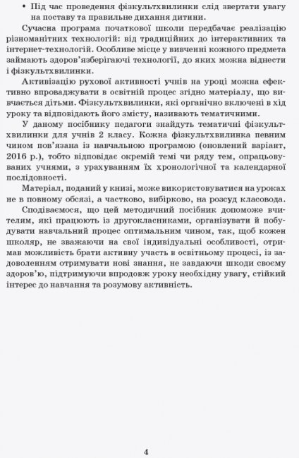 У даному посібнику педагоги знайдуть тематичні фізкультхвилинки для учнів 2 класу. Кожна фізкультхвилинка певним чином пов’язана із навчальною програмою (оновлений варіант, 2016 р.), тобто відповідає окремій темі чи ряду тем, опрацьованих учнями, з урахуванням їх хронологічної та календарної послідовності.