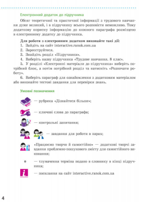 параграфа є ключові слова, контрольні запитання та різноманітні завданнями для закріплен ня матеріалу. У підручнику також наведено розробки практичних робіт з інструкціями для виконання та правилами безпечної праці. На сторінках підручника є посилання на сайт interactive.ranok.ua, де розміщено додатковий матеріал до параграфів, тестові завдання для самоконтролю знань та відеофрагменти до окремих тем.