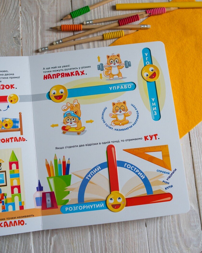 знайомить із базовими математичними поняттями, як-от: точка, лінія, відрізок, кут, форма, розмір, напрямок, відстань, фігура, цифра;