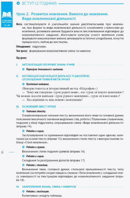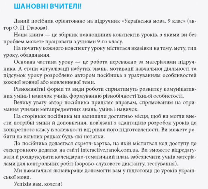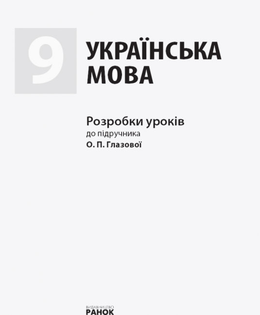 Посібник містить шаблони планів-конспектів усіх уроків з української мови до підручника О. П. Глазової для учнів 9 класу закладів загальної середньої освіти, складені згідно з вимогами чинної