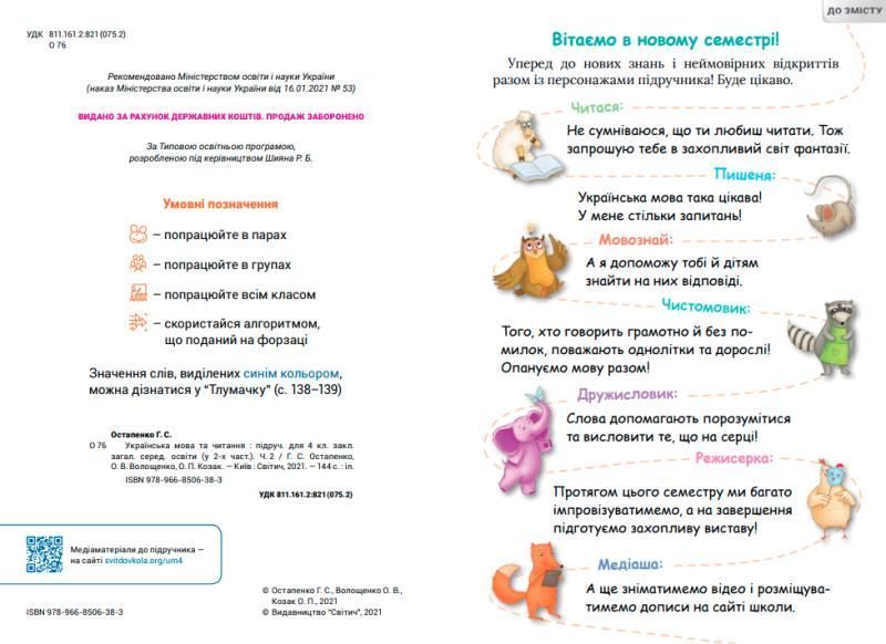 У цьому підручнику “Українська мова та читання 4 клас” Остапенко тебе чекають веселі персонажі, з якими разом будемо досліджувати українську мову та вчитися ефективно спілкуватися. Також нас чекає захоплююча подорож у світ літератури. Разом ми будемо досліджувати українську мову, щоб ти навчився писати без помилок.
